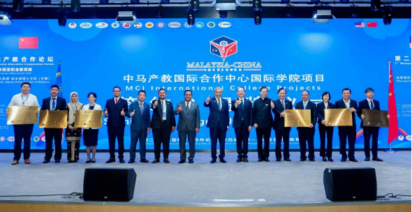 大会期间,在中马产教国际合作中心框架下,多项职业教育合作项目举行了签约与揭牌仪式,包括我校与达雅技术学院、马来西亚全国职业工友会、唐风国际教育集团的“机电一体化专业”职教项目。同时我校凭借在中马教育合作中的积极贡献,荣获“2024—2025中马教育国际合作卓越贡献奖”。