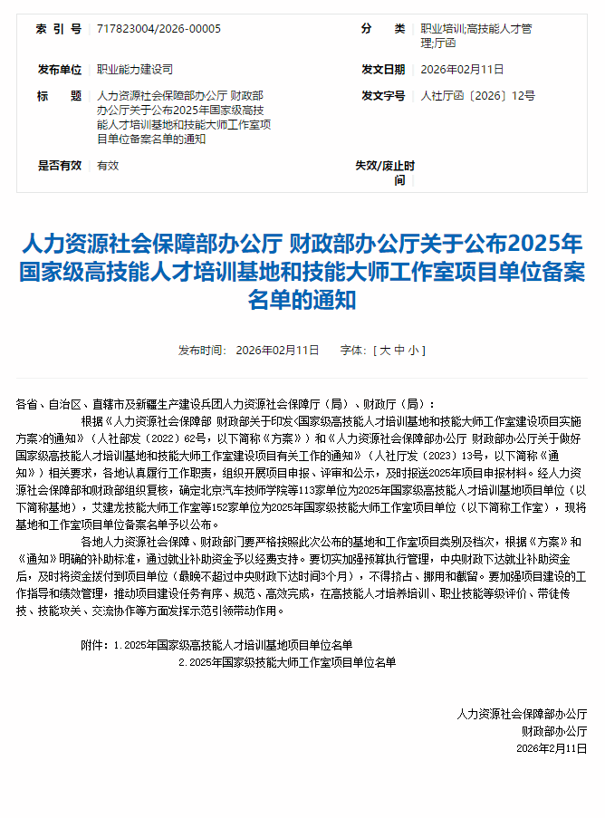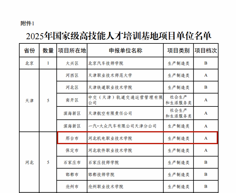 近日,人力资源社会保障部办公厅、财政部办公厅联合公布2025年国家级高技能人才培训基地项目单位备案名单。我校凭借扎实的办学基础、完备的实训条件及突出的人才培养成效成功入选,办学实力获国家层面高度认可。