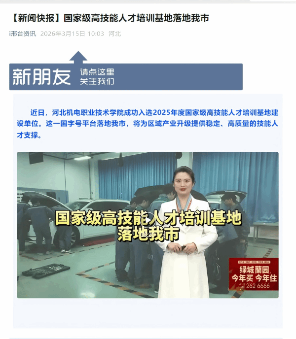 近日,邢台《新闻快报》报道了我校获批2025年度国家级高技能人才培训基地。这一国字号平台落地我市,将为区域产业升级提供稳定、高质量的技能人才支撑。(邢台《新闻快报》https://mp.weixin.qq.com/s/q8A8D-cOLl1kTgRc4Nq8eQ)